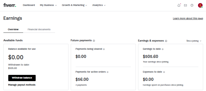 yap, gambar di atas adalah dashboard earning saya di situs yang menurut saya paling bagus untuk freelance desain, benar sekali situs tersebut adalah Fiverr.